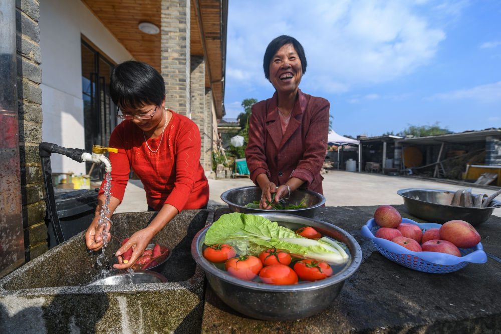 ↑2020年10月10日,浙江省杭州市临安区天目山镇九狮村村民在家门口用刚接通不久的自来水洗菜。2018年以来,杭州市临安区以管网扩网、联村供水工程为主,单点补充为辅,通过规模化集中式供水工程建设,让乡村百姓用上便捷的“放心水”。