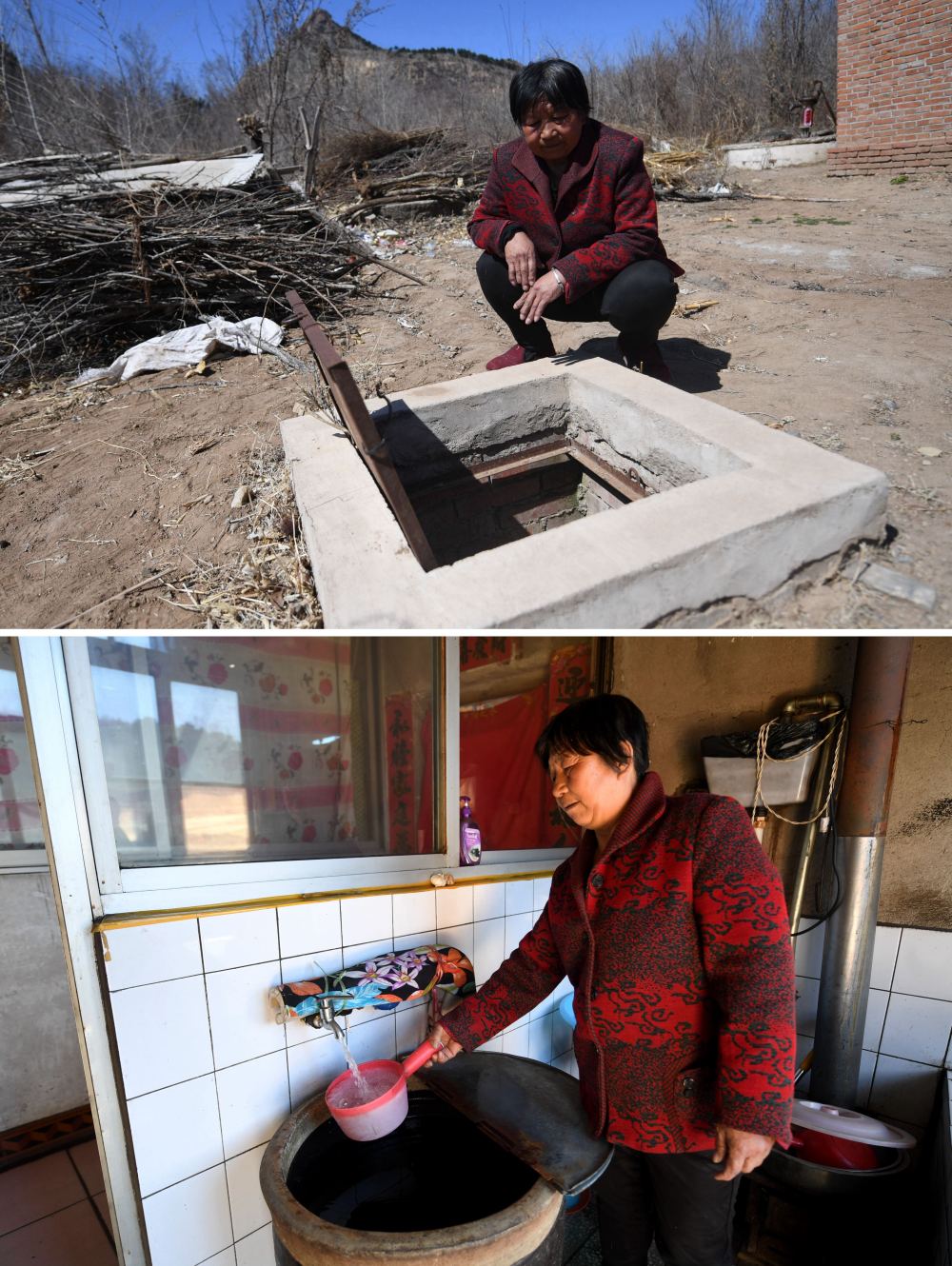 ↑拼版照片上图:河北省平泉市杨树岭镇五道梁子村村民李秀芝在曾经用过的雨水窖旁;下图:李秀芝在家中使用自来水(2020年4月2日摄)。