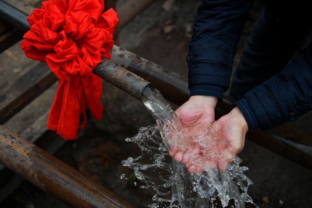 ↑2019年11月20日,在山西省临汾市翼城县南梁镇南岭村打井工程竣工仪式现场,一名村民用手捧着井下抽上来的水。从这一天起,这个百年“旱井村”有了自己的深水井。