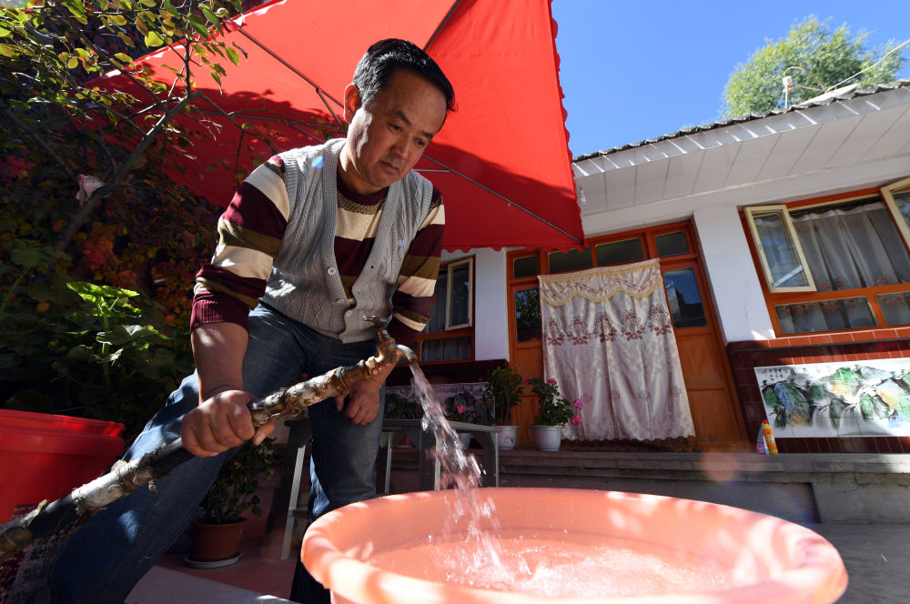 ↑2016年10月17日,甘肃省临夏回族自治州临夏市城郊镇肖家村村民使用引黄济临供水工程的自来水。