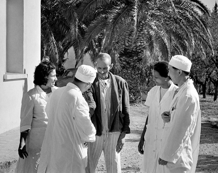 1966年12月14日,中国医疗队与一名阿尔及利亚患者交谈。新华社发