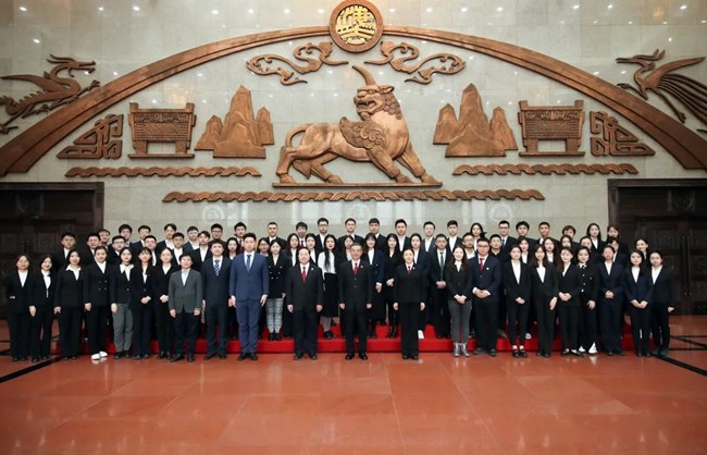 图为周强、贺荣、马世忠同第六批实践锻炼青年学者、第十一批法律实习生合影。