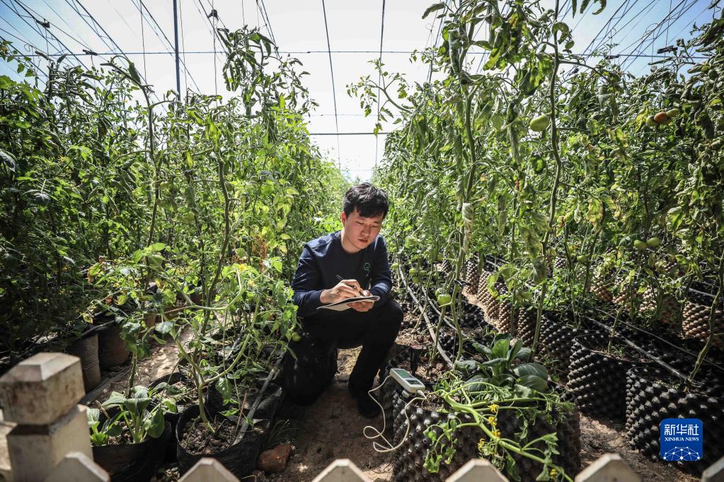在辽宁省盘锦市大洼区田家街道大堡子村,回乡创业大学生郭佳明在温室大棚内查看碱地西红柿的生长情况(2019年4月15日摄)。新华社记者 潘昱龙 摄