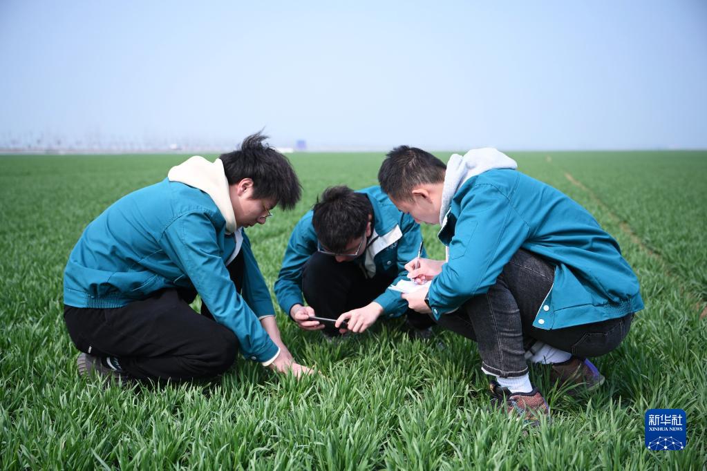 在河南省驻马店市西平县老王坡高标准农田示范区,台晓林(左)、王仲琦和王英凡(右)一起查看苗情并做记录(2023年2月28日摄)。新华社记者 张浩然 摄