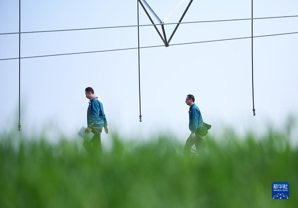 在河南省驻马店市西平县老王坡高标准农田示范区,刘亚辉(右)和王英凡在对平移式水肥一体化喷灌机进行巡检(2023年2月28日摄)。新华社记者 张浩然 摄