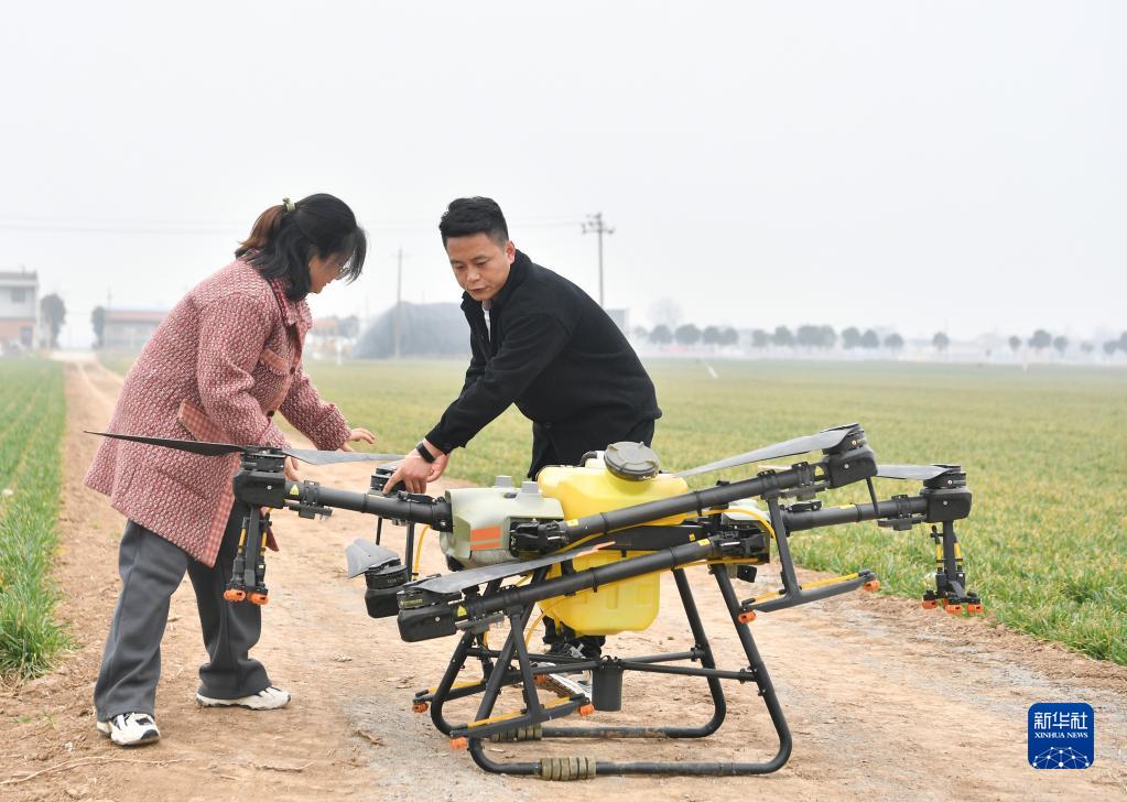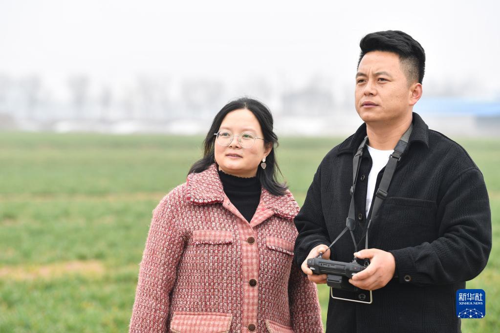在陕西省宝鸡市陈仓区慕仪镇齐西村的农田,齐叶叶与齐昆(右)操控植保无人机管护作物(2023年2月27日摄)。新华社记者 张博文 摄