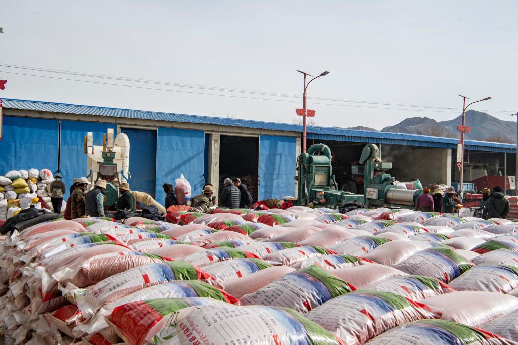 在西藏日喀则市江孜县紫金乡努堆村的农机农民专业合作社内,两台青稞种谷物精选机正开足马力,给新收获的青稞良种过筛、除杂、包衣、装袋,50公斤一袋的青稞良种已码满大半个院子。