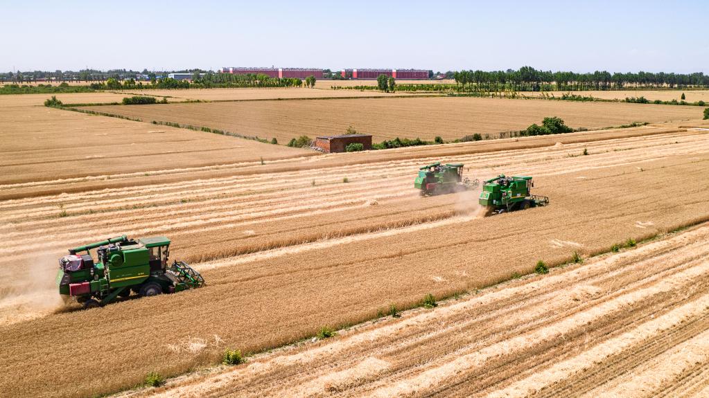 6月10日,在石家庄市藁城区一处农田里,联合收割机进行麦收作业。(王俭 摄)