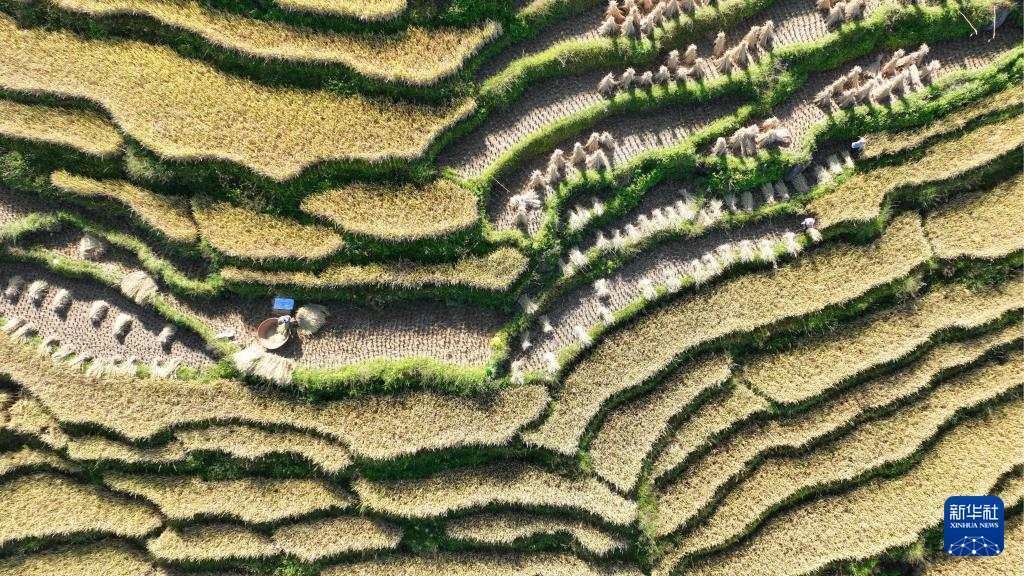 10月27日,在云南省腾冲市荷花镇汪李村,农民在收获晚稻(无人机照片)。