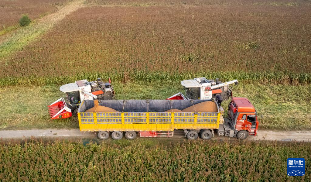 10月28日,在河南省商丘市夏邑县会亭镇花园村,收割机将收获的高粱装车外运(无人机照片)。