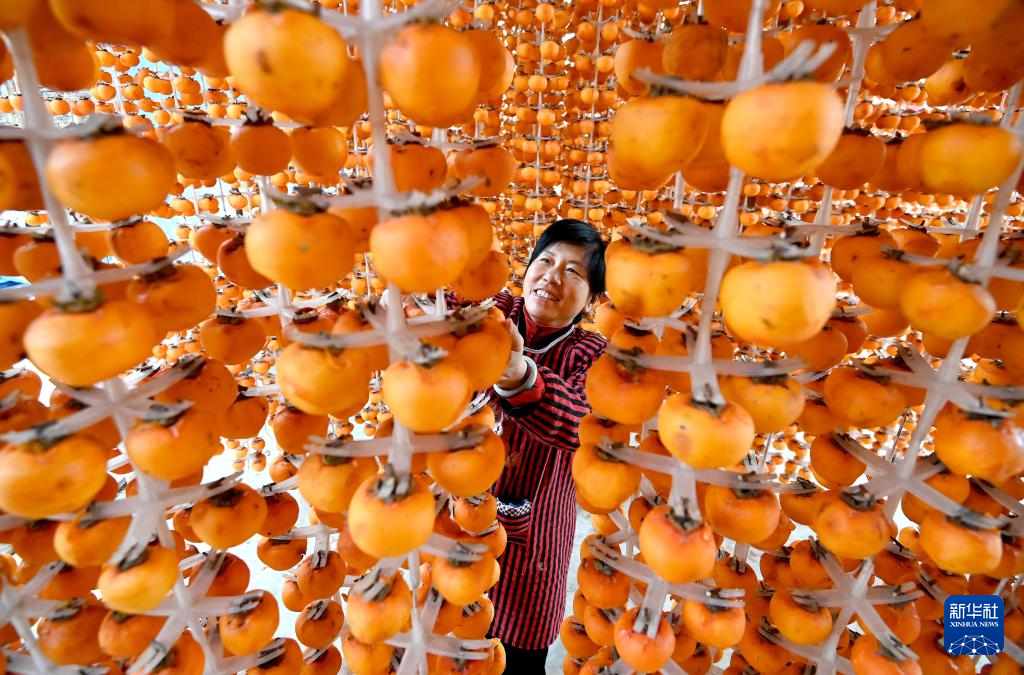 10月28日,河北省邯郸市磁县北贾璧乡北贾璧村的农民在吊晒柿子。