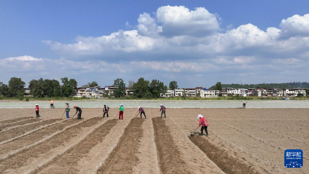 10月28日,在四川省遂宁市蓬溪县红江镇白坪村,村民在为种植芍药做准备(无人机照片)。