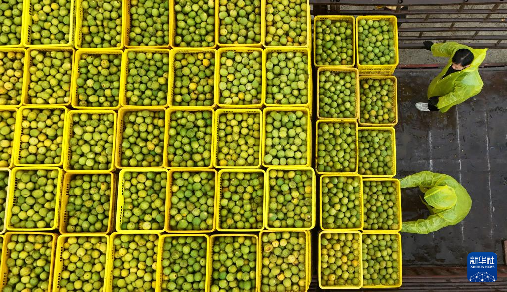 10月27日,在广西桂林市龙胜各族自治县龙脊镇中六村,果农在将罗汉果装车外运(无人机照片)。