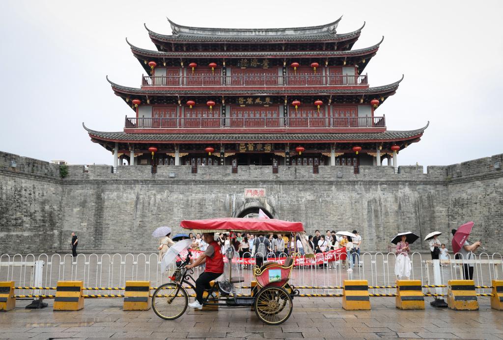 5月28日,游客在潮州广济楼前参观游览。新华社记者 毛思倩 摄