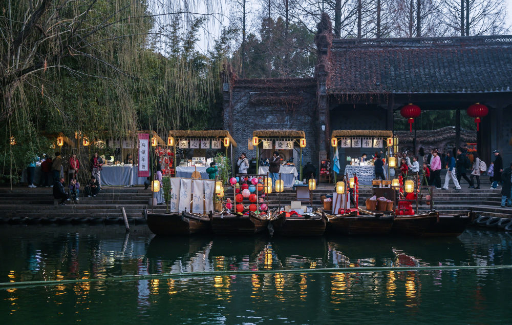 2025年1月23日拍摄的乌镇景区内的水上市集。1月23日至2月12日,浙江桐乡千年古镇乌镇景区融合水乡非遗推出江南水乡迎春“水灯会”,整个灯会由十余组大型灯组组成,将传统非遗与现代科技完美融合,结合古镇长街宴、水上市集、传统非遗技艺展示等活动,在新春佳节为游客们呈现一场视觉盛宴。