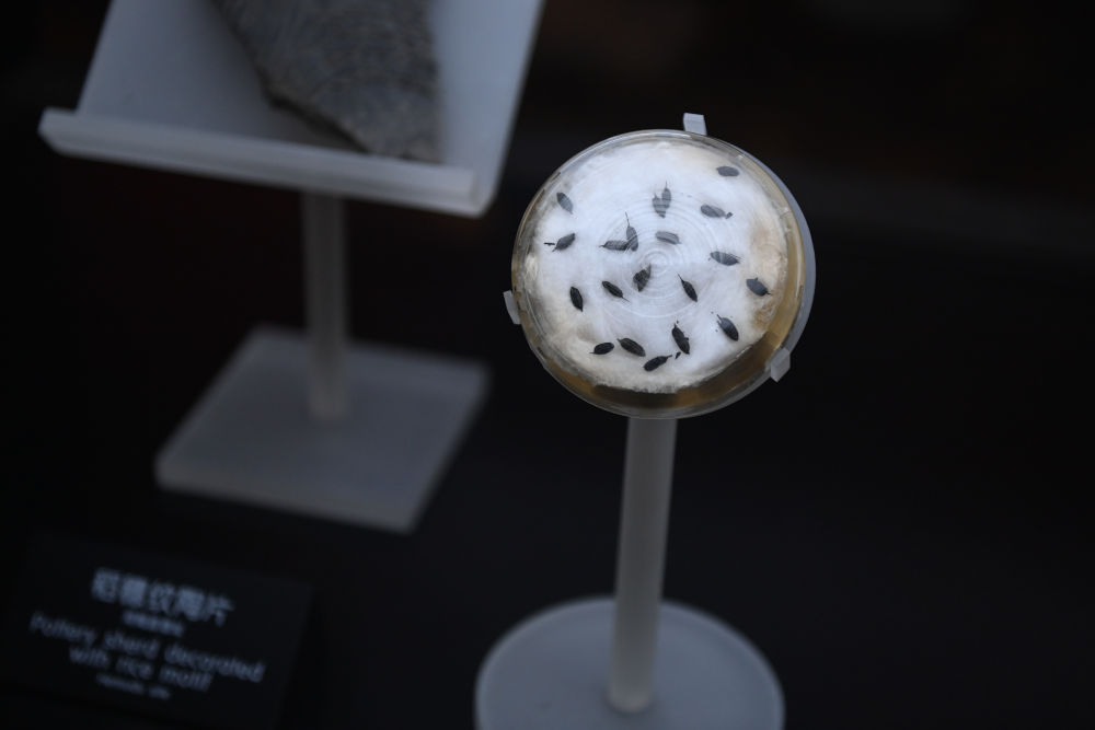 2023年11月3日在浙江省余姚市河姆渡遗址博物馆拍摄的出土稻谷。河姆渡遗址距今有7000年至5300年历史。遗址出土6700余件文物、大量的人工栽培水稻、大片的木构建筑遗迹和丰富的动植物遗存,为研究农业、畜牧、建筑、编织、艺术和中国文明的起源、发展进程提供了极其珍贵的实物资料,2021年入选“百年百大考古发现”。