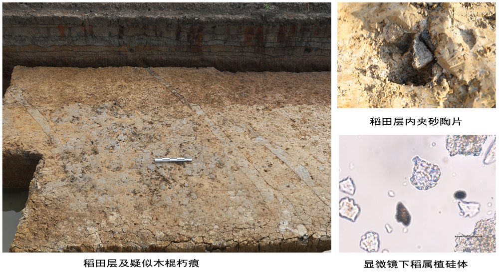 图为浙江衢州皇朝墩遗址早期稻田遗存及相关依据(拼版照片,资料照片)。皇朝墩遗址是一处新石器时代早中期聚落遗址,年代距今约9300—8000年,发现有台地、环壕及水稻田等重要遗迹,揭示了上山文化至跨湖桥文化时期的稻作农业聚落,是长江下游早期稻作农业社会的生动缩影。