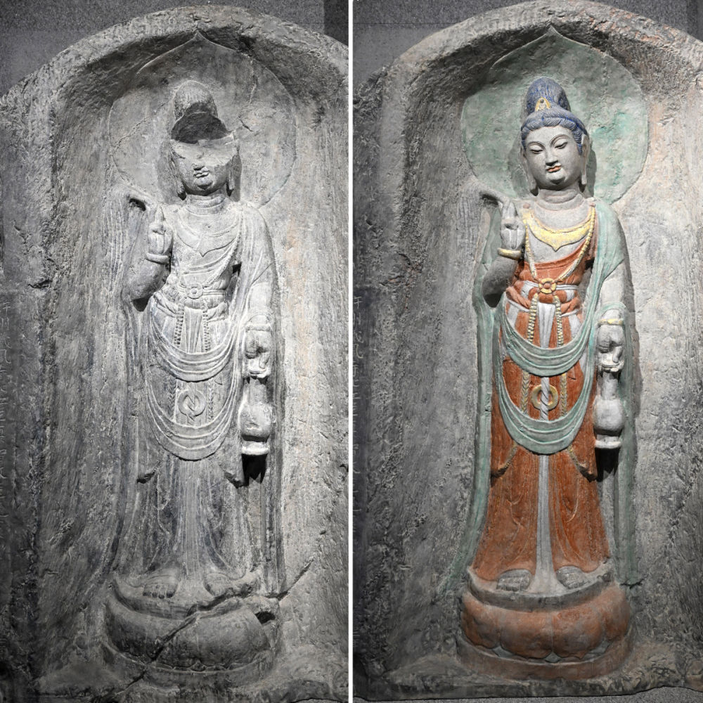 拼版照片:左图为洛阳龙门石窟万佛洞窟前南壁菩萨造像的3D打印模型;右图为利用数字化技术复原后的3D打印模型(2025年4月10日摄)。新技术、新材料的广泛应用提升了文物保护的效率和水平,也为“最小干预”“修旧如故”提供了更多可能。