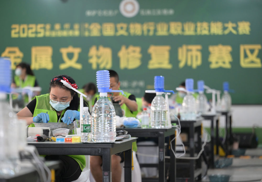 2025年7月5日,来自广西文物保护与考古研究所的在读博士黄伟(前)在比赛现场修复文物。在进入决赛的293名参赛选手中,本科及以上学历超53%,其中包括45名硕士和1名博士。越来越多高素质人才加入到文物保护修复的队伍中,为行业的高质量发展作出重要贡献。