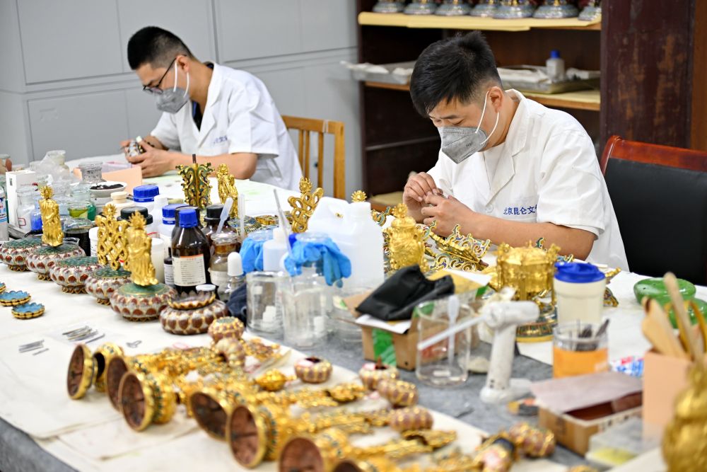 2025年5月30日,文物修复师在河北承德避暑山庄博物院修复珐琅器。