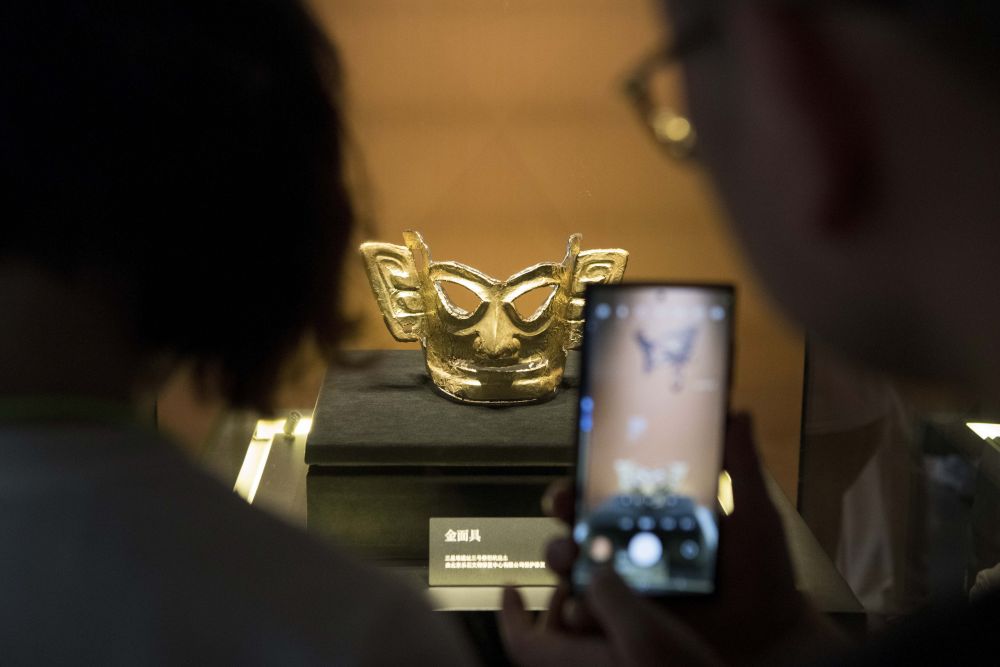 2024年7月22日,在四川广汉三星堆博物馆文物保护与修复馆,游客在参观修复后的金面具。科技赋能让文物活起来,观众得以参与一场能“听见”“触摸”“走入”的跨时空文明对话。
