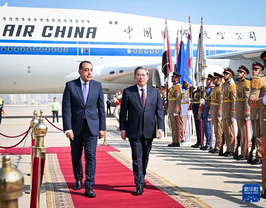埃及总理马德布利率政府高级官员到机场迎接,在机场为李强总理举行欢迎仪式。李强在马德布利陪同下检阅了仪仗队。中国驻埃及大使廖力强也到机场迎接。