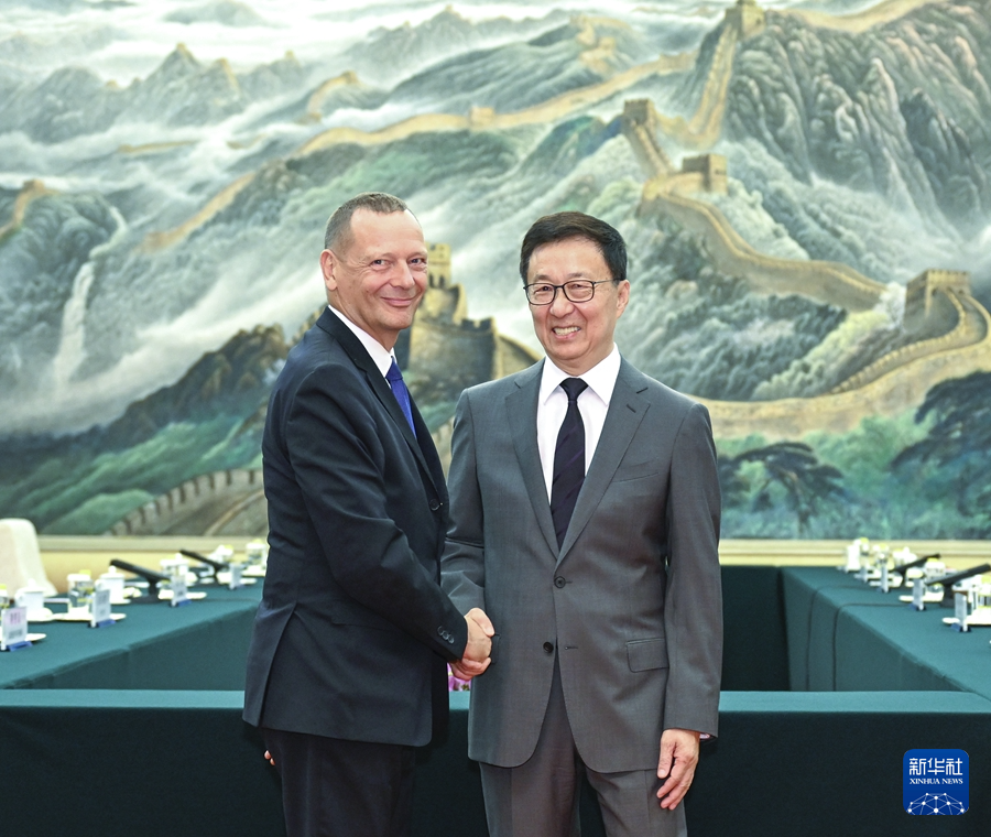 10月16日下午,国家副主席韩正在北京会见法国总统外事顾问博纳。 新华社记者 张领 摄