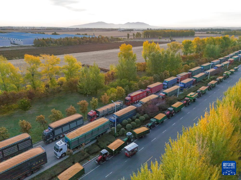 10月15日,卖粮车在黑龙江省佳木斯市富锦市一粮食收储企业门前排队(无人机照片)。