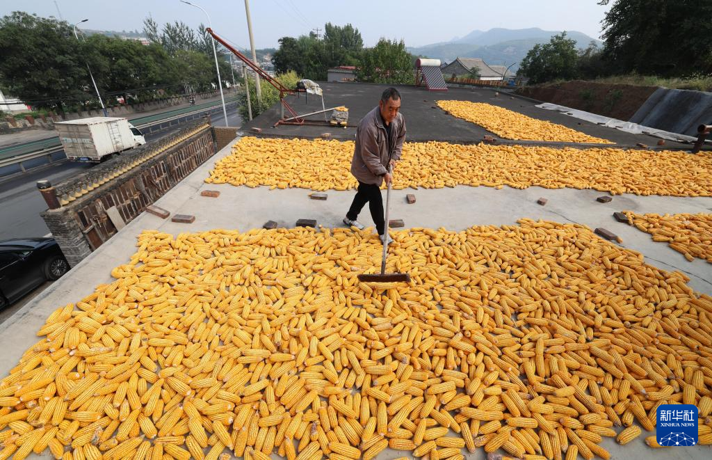 10月15日,河北省石家庄市井陉县秀林镇南横口村村民在晾晒玉米。