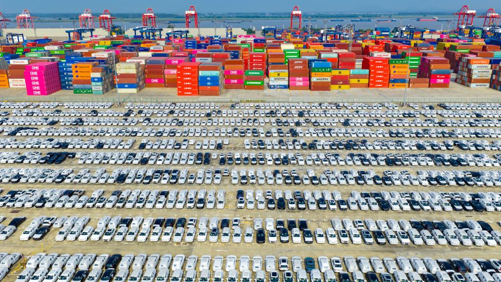 图为10月4日在江苏省港口集团南京港龙潭港区拍摄的准备装船出口的汽车(无人机照片)。新华社发(杨素平摄)