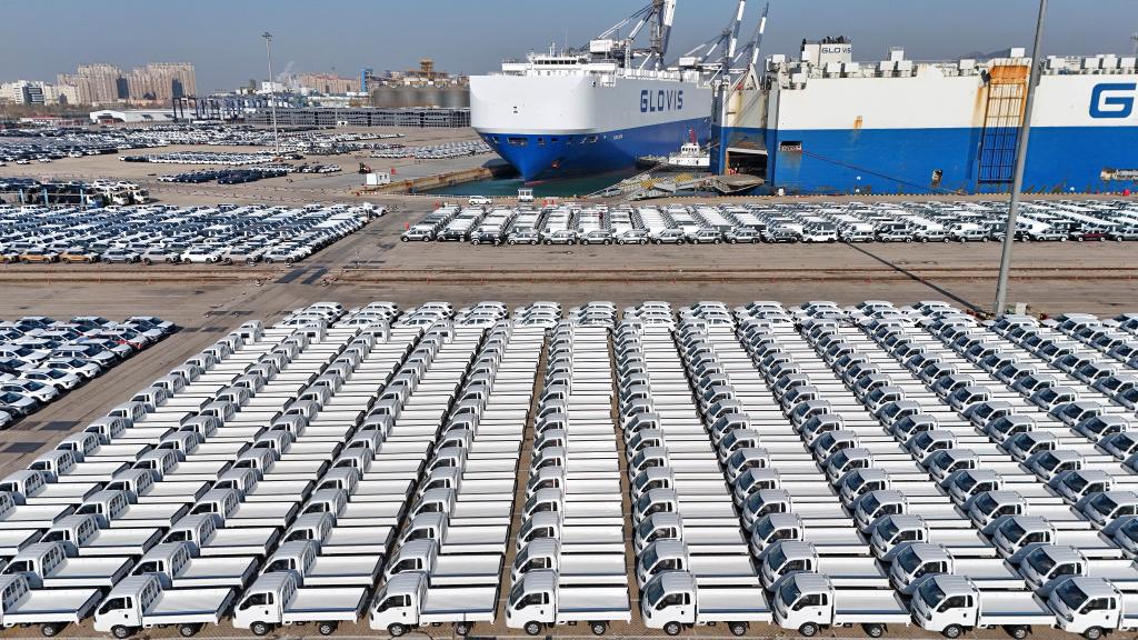 12月4日,汽车停在山东港口烟台港等待装船(无人机照片)。新华社发(唐克摄)