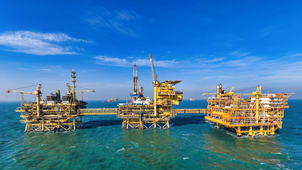 这是12月21日拍摄的渤海油田海上油气平台作业现场(无人机照片)。12月21日,中国海油宣布,我国海上最大油田——渤海油田2025年累计生产油气当量突破4000万吨,创历史新高,为国家能源安全和经济社会高质量发展提供坚实保障。新华社发(杜鹏辉摄)