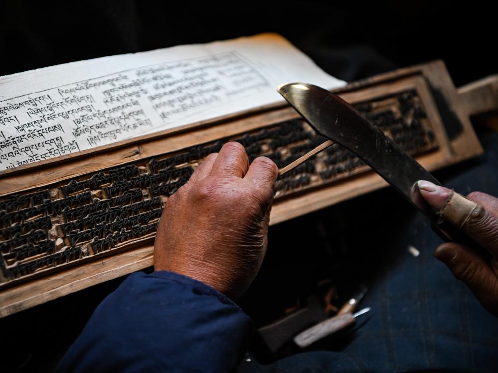 2024年11月2日,在德格印经院,工人在制作院藏印版。新华社记者 王曦 摄