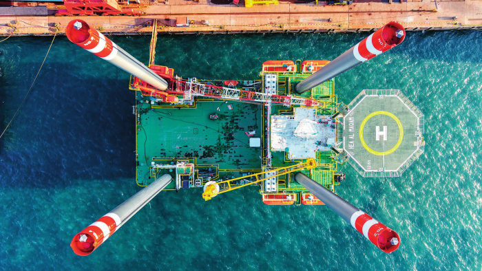 在青岛海西湾船舶与海洋工程产业基地,海上作业平台在建设中(2025年12月24日摄)。新华社发(俞方平摄)