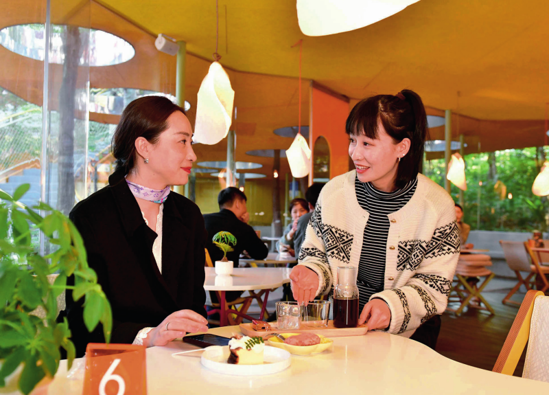山东省五莲县白鹭湾小镇是山东省乡村振兴齐鲁样板示范区。图为在五莲县白鹭湾小镇咖啡与树咖啡厅,咖啡师赵敏(右)为客人端来茶点(2024年10月23日摄)。郭绪雷摄/本刊