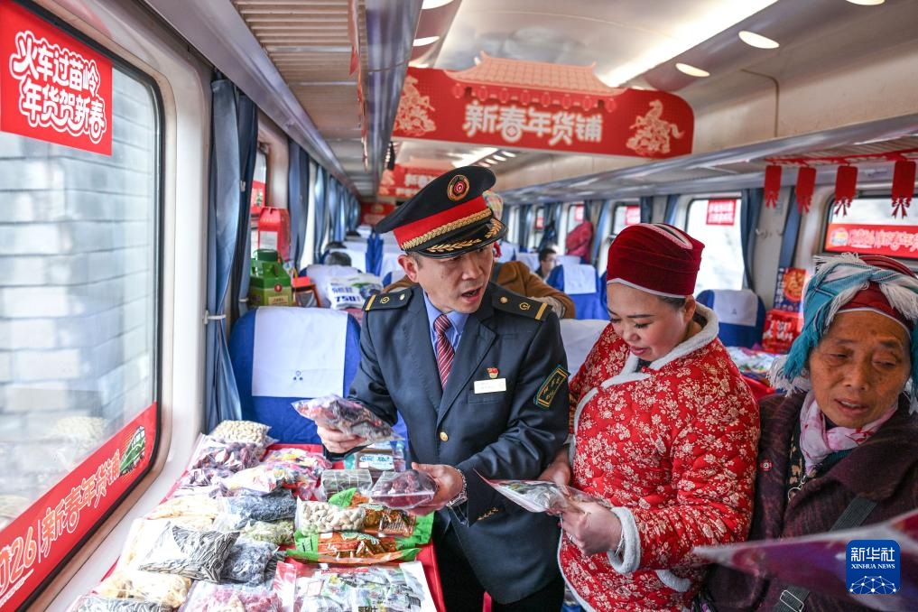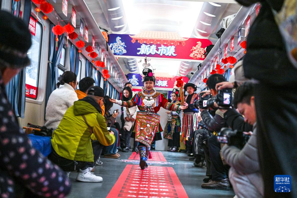新春将至,贵州贵阳开往玉屏的5640次“慢火车”装饰一新,喜庆的车厢、新鲜的农产品、特色民族歌舞、精美非遗展示等让这趟穿行于苗乡侗寨的山区“慢火车”载满浓浓的新春年味。
