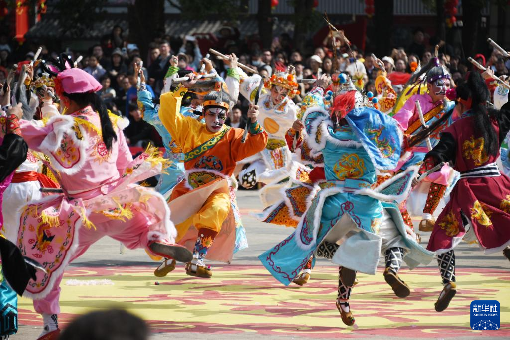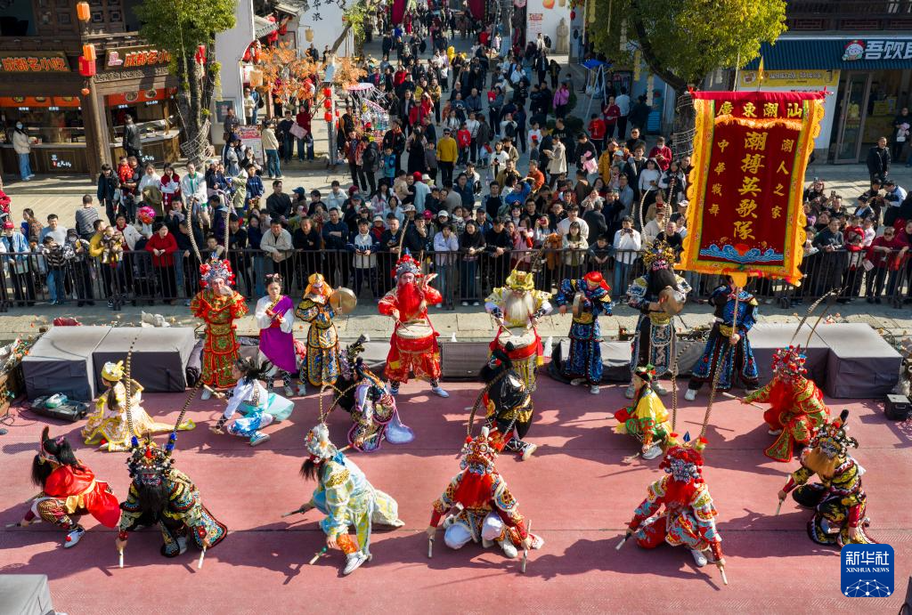 2月20日,在湖北省孝感市云梦祥云湾文化旅游景区,游客在观看英歌舞表演(无人机照片)。