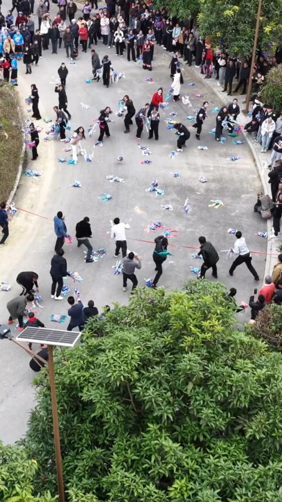 布依族标志性民俗“打糠包”,是群众和游客互动交流、共庆新春的一种别样形式。活动中,青年男女手持糠包相互抛接,在欢乐互动中传递新春美好祝福。