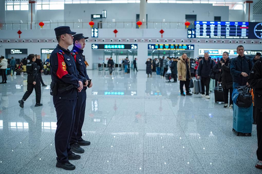 农历正月初七(2月23日),铁路公安民警在通化站候车室执勤。新华社发(刘春明摄)