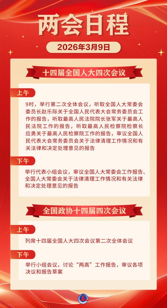 9日上午,出席全国政协十四届四次会议的全国政协委员列席十四届全国人大四次会议第二次全体会议;下午,全国政协十四届四次会议举行小组会议,讨论“两高”工作报告,审议各项决议和报告草案。