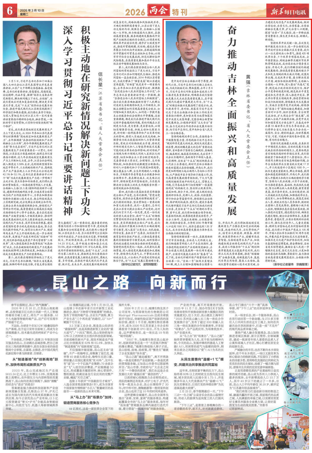 坚持创新驱动第一动力,在提质焕新中守牢实体根基。吉林是人文科教大省,我们畅通教育科技人才产业良性循环,着力推进科技创新同产业创新深度融合,去年全球最大绿色氢氨醇一体化项目建成投产,全国首列氢能文旅列车“氢春号”正式下线,吉林化纤碳纤维产销量均跃升至全球第一位,“吉林一号”组网卫星增至144颗,规上工业增加值增幅居全国第七位。开局之年,我们将把因地制宜发展新质生产力摆在更加突出的战略位置,改造升级汽车、石化等传统产业,培育壮大新能源、新装备、新材料、新医药等新兴产业,前瞻布局具身智能、生物制造等未来产业,加快构建体现吉林特色的现代化产业体系。政府工作报告和“十五五”规划纲要草案高度关注氢能开发利用,我们将立足风光资源禀赋,推进“制储输用”全链条发展,创新氢能汽车、氢能列车等应用场景。聚焦工业母机、高端仪器等关键核心技术攻坚突破,全力建设光电信息产业发展新高地。做好冰雪运动、冰雪文化、冰雪装备、冰雪旅游融合发展文章,扩大冰雪人口规模,探索“冰雪+”多元路径,进一步释放投资消费潜力,催生更多新业态、新模式、新动能。