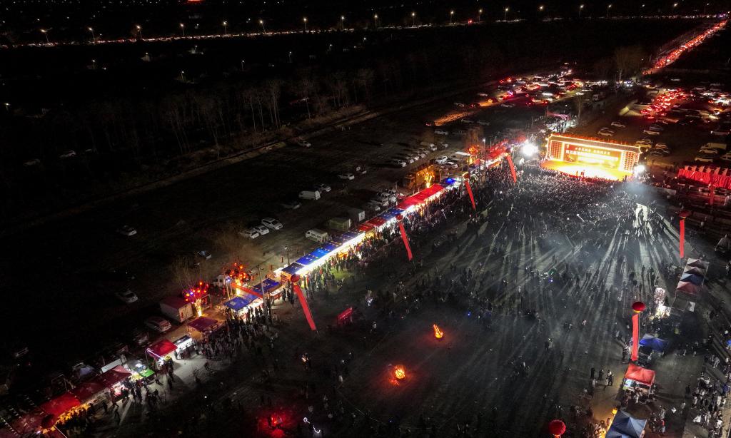 这是3月11日拍摄的宁夏银川市贺兰县新平村第四届燎疳节活动现场(无人机照片)。新华社记者 冯开华 摄