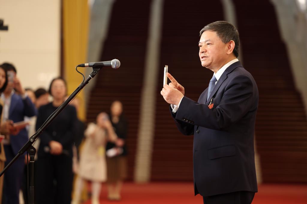2026年3月12日,生态环境部部长黄润秋在十四届全国人大四次会议第三场“部长通道”展示一块环境DNA测序芯片。新华社记者 金立旺 摄