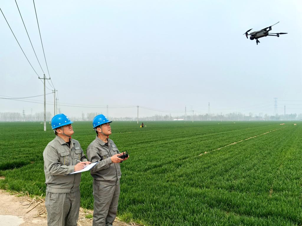 3月27日,国网馆陶县供电公司工作人员在清阳城村巡视春灌线路。新华社记者 赵鸿宇 摄