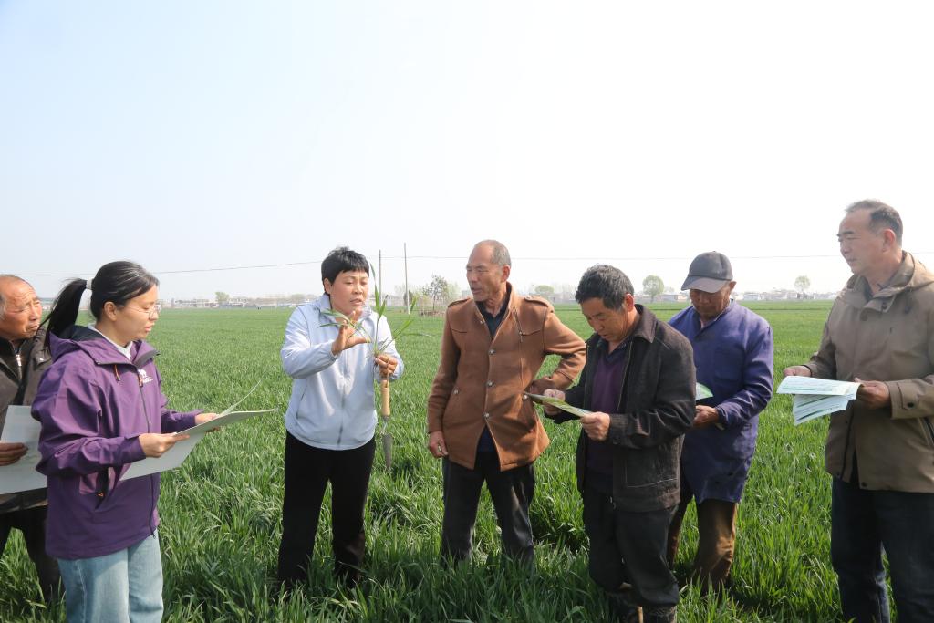 4月3日,邢台市南和区农技人员在田间地头为农户讲解冬小麦管理技术。新华社记者 赵鸿宇 摄